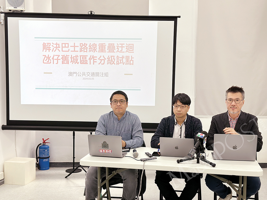 Local think tank Macau Synergy Association held a press conference yesterday at its office regarding circuity and the overlapping of bus routes, as well as traffic jams caused by too many bus routes stopping at the same bus stops at the same time, crowded buses on some routes and insufficient waiting space, urging the government to streamline the routes by categorising them into five types, such as express routes, trunk routes and short routes, while also setting up a three-tiered busing system such as to expand Chun Su Mei Terminal to serve as a pilot transport hub in Taipa.