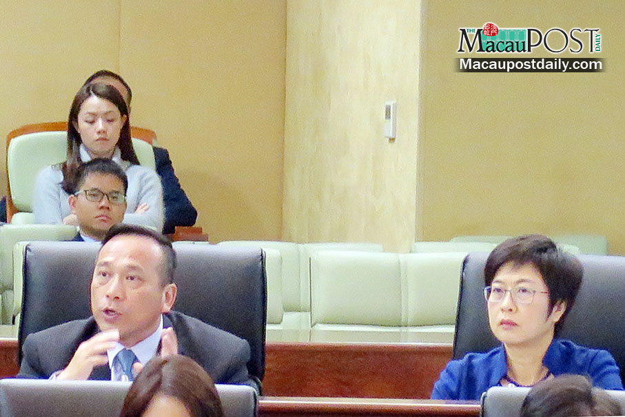Judiciary Police (PJ) Director Chau Wai Kuong (left, front) speaks during yesterday’s plenary session in the legislature’s hemicycle as Secretary for Administration and Justice Sonia Chan Hoi Fan (right, front) looks on. Photo: Tony Wong
