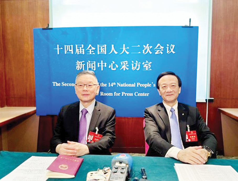 Local deputies Lao Ngai Leong (right) and José Chui Sai Peng pose during a press briefing yesterday after the closing meeting of the second session of the 14th National People’s Congress (NPC) in Beijing. – Photo courtesy of TDM