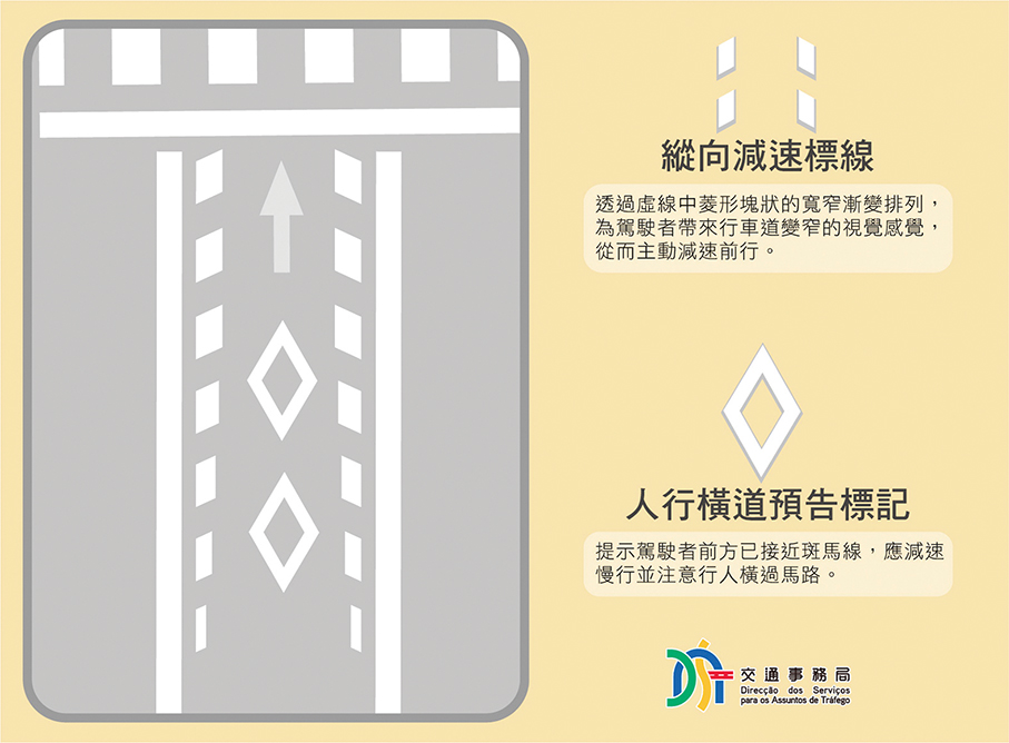 The Transport Bureau (DSAT) has painted a new type of road marking on a road section leading to a zebra crossing on Rotunda de Leonel de Sousa (roundabout) in Taipa, with the aim of reminding drivers to reduce speed there.