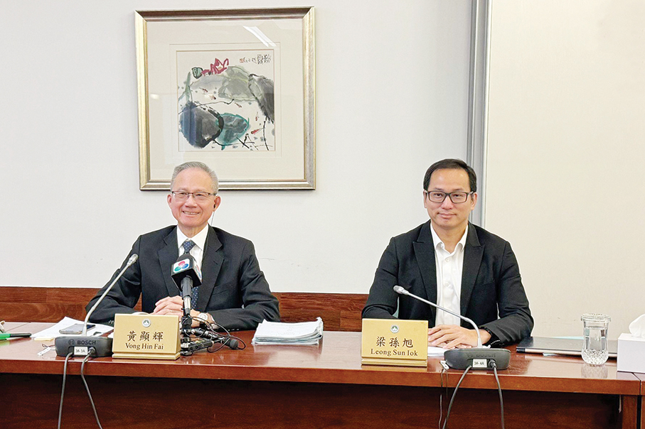 Legislator-cum-lawyer Vong Hin Fai (left), who chairs the legislature’s 3rd Standing Committee, and lawmaker-cum-unionist Leong Sun Iok, the committee’s secretary, look on during yesterday’s media briefing. – Photo courtesy of TDM
