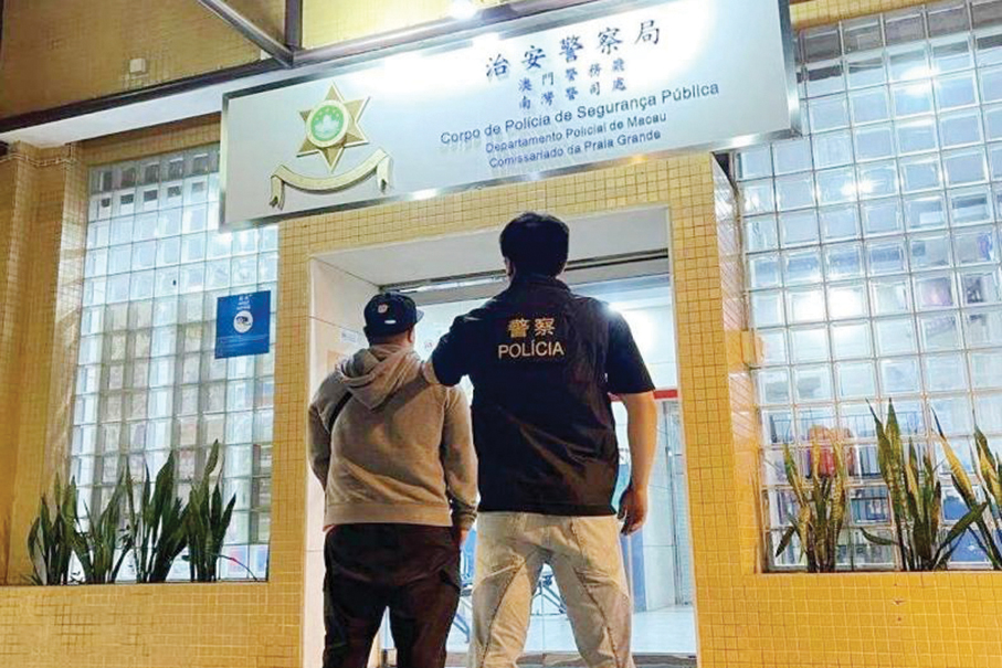 This undated photo provided by the Public Security Police (PSP) on Friday shows a PSP officer escorting the theft-by-finding suspect from the Philippines to the Nam Van PSP station.
