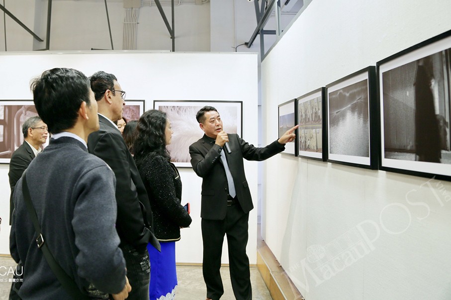 This handout photo recently provided by Creative Macau shows local photographer Alex Chao Io Chong introducing his works to guests at his exhibition’s opening ceremony last month.