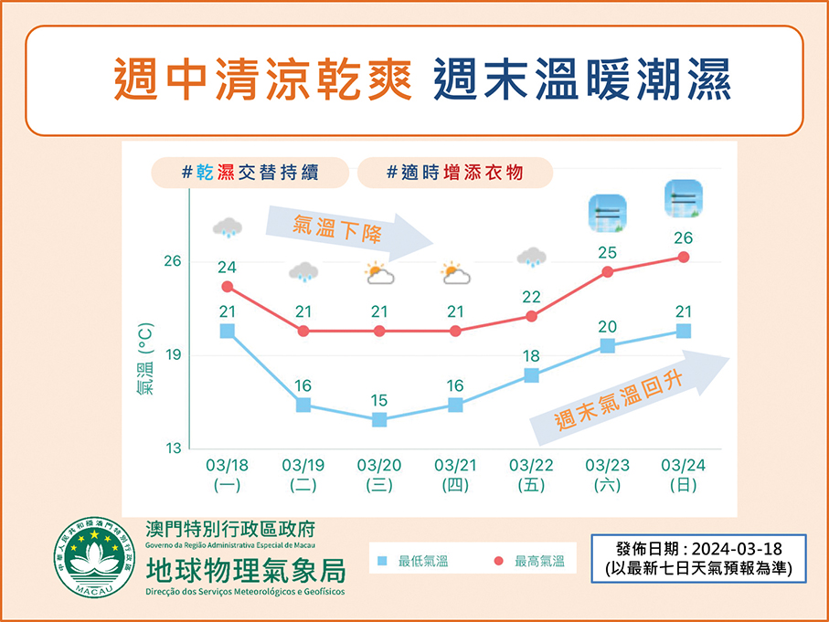 A statement by the Meteorological and Geophysical Bureau (SMG) yesterday also said it expected the temperature and humidity in Macau to continue to change frequently this week, with alternating wet and dry weather.