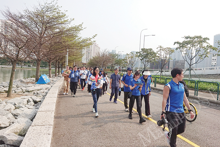 Marine and Water Bureau (DSAMA) Director Susana Wong Soi Man (first from left) walks along the coastal walking trail of the Taipa Waterfront Leisure Area on Sunday during her bureau’s annual event aiming to raise residents’ awareness of tap-water saving. – Photo: Tony Wong
