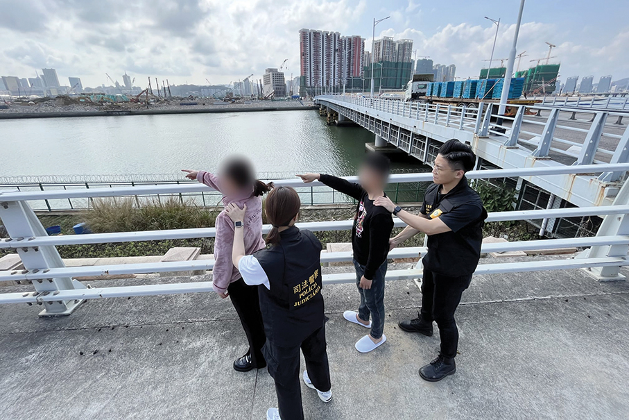 This photo provided by the Judiciary Police (PJ) yesterday shows the local snakehead couple pointing at the location where they picked up the illegal immigrants from the mainland near the Hong Kong-Zhuhai-Macau Bridge (HZMB) checkpoint.