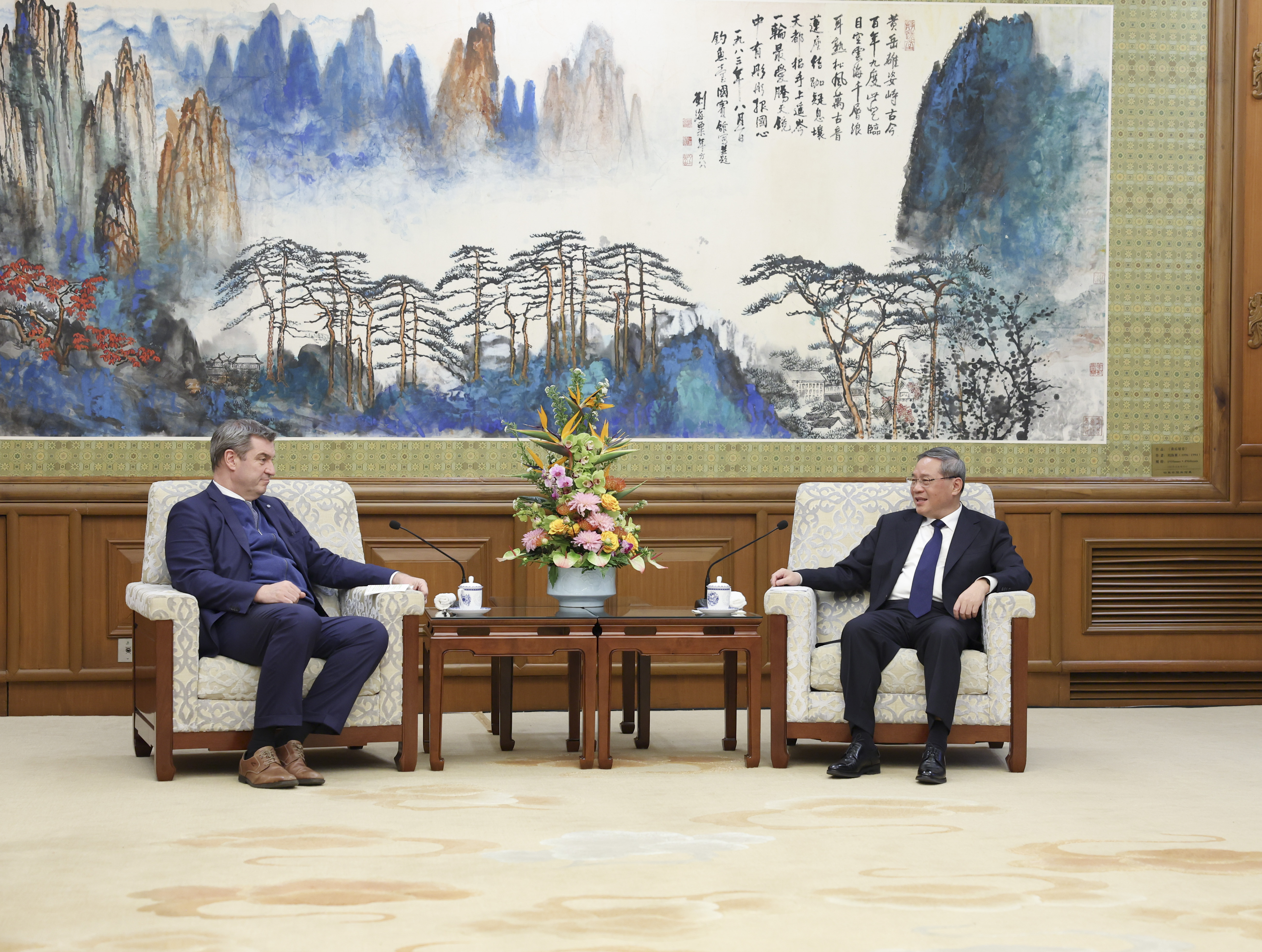 Caption: Premier Li Qiang (right) meets with Markus Söder, minister-president of Bavaria, southern Germany, at the Diaoyutai State Guesthouse in Beijing yesterday. – Xinhua