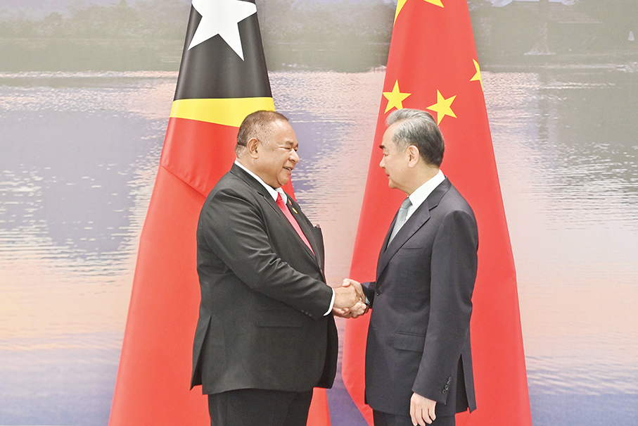 Foreign Minister Wang Yi (right), also a member of the Political Bureau of the Communist Party of China (CPC) Central Committee, shakes hands with Bendito dos Santos Freitas, minister of foreign affairs and cooperation of Timor-Leste, in Nanning, capital of the Guangxi Zhuang Autonomous Region, on Thursday. – Xinhua