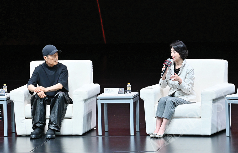 Chinese filmmaker and MGM 2049 Chief Director Zhang Yimou (left) looks on as MGM China Holdings Limited Chairperson and Executive Director Pansy Ho Chiu-king speaks during yesterday’s symposium at the MGM Theatre in Cotai. – Photo: Rui Pastorin