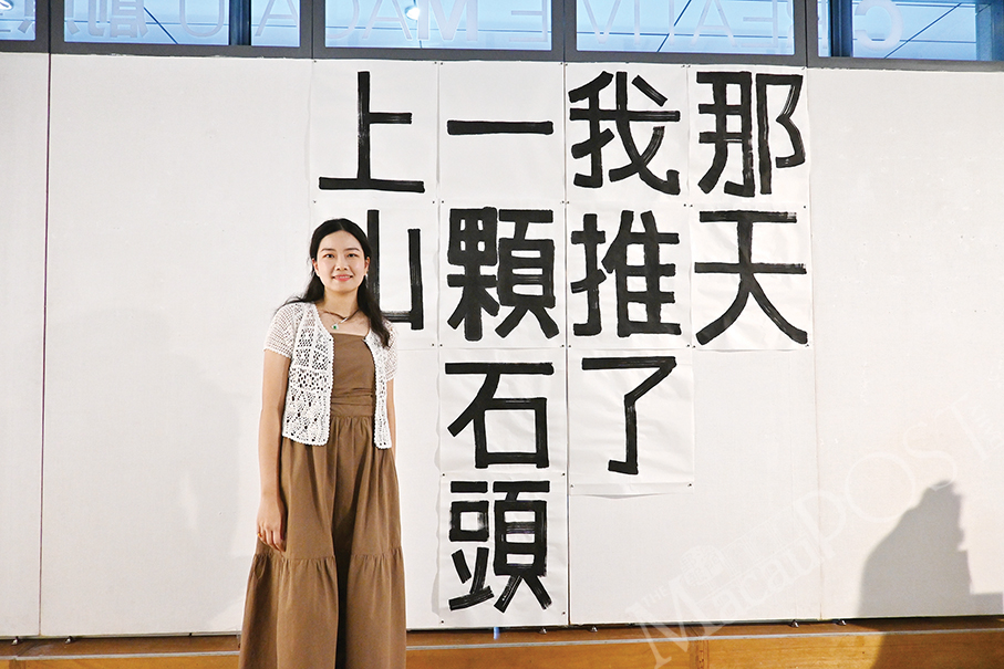 Artist Angela Hoi Ka Ian poses in front of the title of her exhibition.