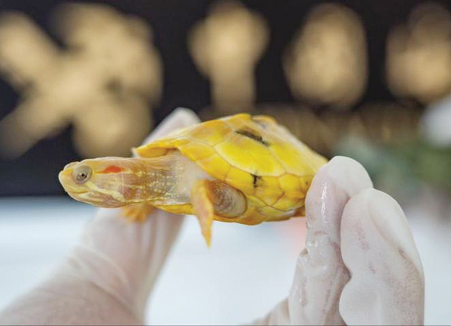 This undated handout photo provided by the Zhuhai’s Gongbei Customs in 2022 shows one of the red-eared baby hatchlings seized by the authorities at that time.