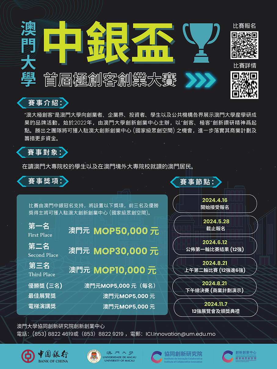 For applications, visit https://go.um.edu.mo/1zzy8bsb, while details are on https://go.um.edu.mo/847u5mgu. For enquiries, call 8822 4619 or 8822 9219, or email ICI.Innovation@um.edu.mo.