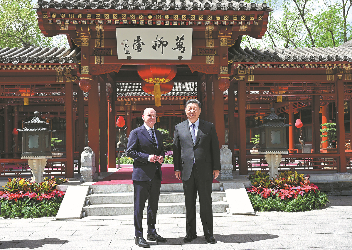 BEIJING – President Xi Jinping met with German Chancellor Olaf Scholz yesterday at the Diaoyutai State Guesthouse in Beijing, calling on the two sides to carry forward the distinctive characteristics of mutual benefit and win-win outcomes and achieve mutual success.
