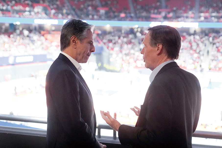 US Secretary of State Antony Blinken (left) talks with US Ambassador to China Nicholas Burns at a basketball game between the Shanghai Sharks and the Zhejiang Golden Bulls at the Shanghai Indoor Stadium in Shanghai on Wednesday. – Agencies via China Daily
