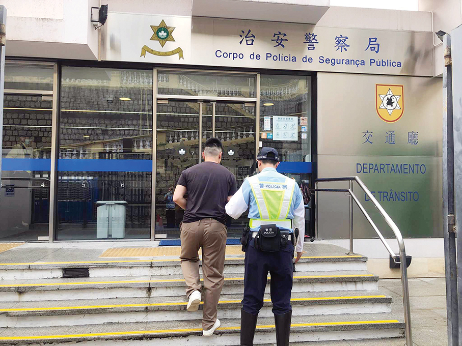 This undated handout photo provided by the Public Security Police (PSP) yesterday shows the local drunk-driving suspect being escorted by a PSP officer to the Traffic Police headquarters.