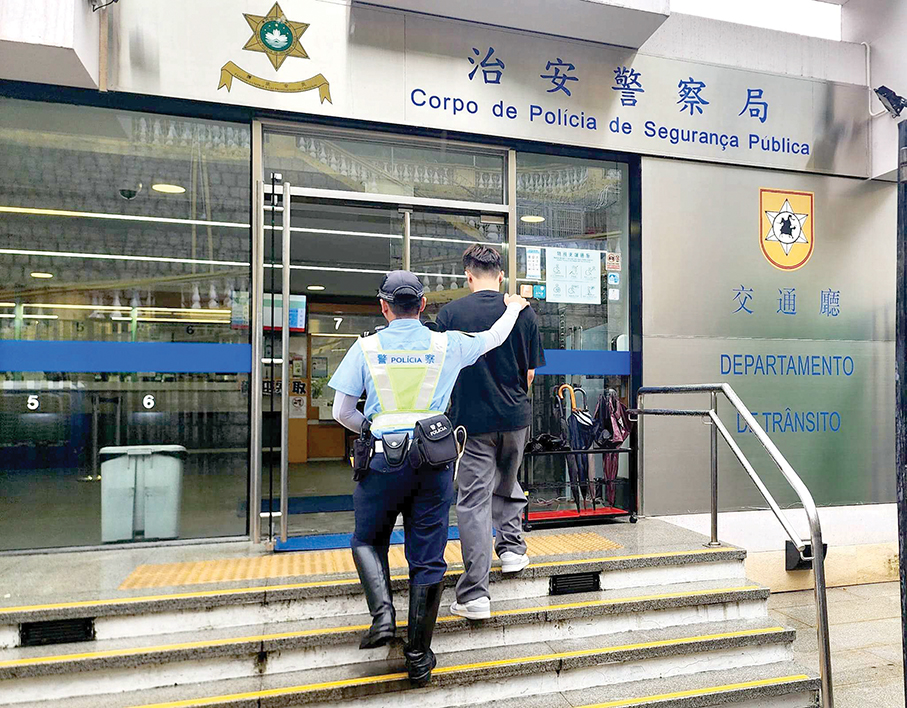 This undated handout photo provided by the Public Security Police (PSP) yesterday shows the local drunk-driving suspect being escorted by a PSP officer to the Traffic Police headquarters.