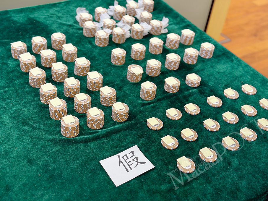 The Judiciary Police received a report from a casino in Cotai on Tuesday, saying that when one of its gamblers went to the cage cashier to exchange 10 HK$10,000 chips for cash, one of the chips was found to be different and was suspected to be fake, Tang said, noting that in the course of the investigation, PJ officers received other reports from 14 non-resident gamblers about the counterfeit casino chips.