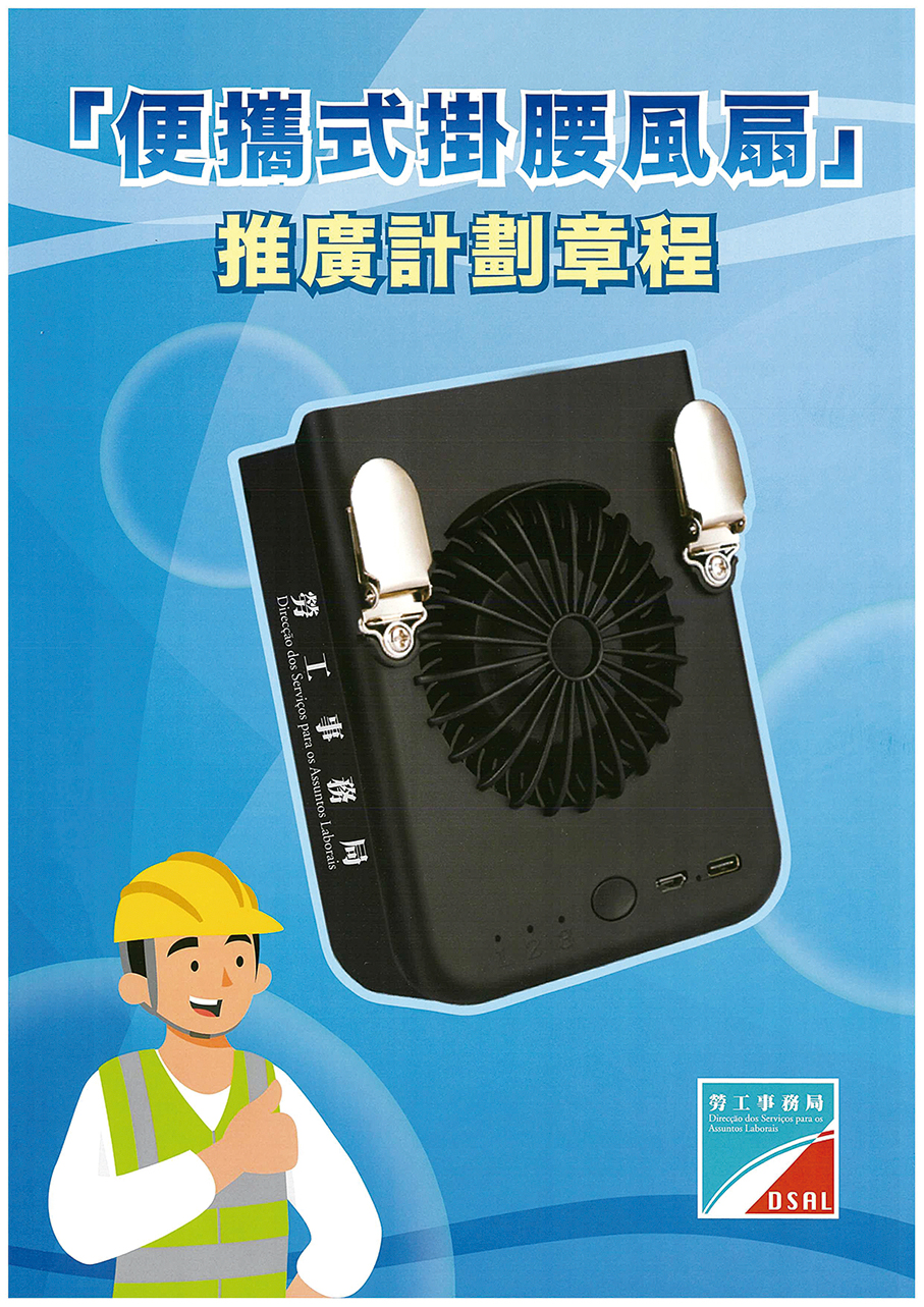 This poster provided by the Labour Affairs Bureau (DSAL) yesterday promotes the portable fan being distributed by the government free of charge to certain categories of outdoor and even indoor workers.