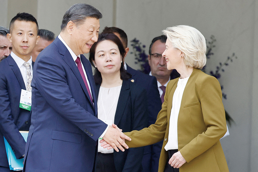 President Xi Jinping (front, left) shakes hands with European Commission President Ursula von der Leyen as they leave after holding a trilateral meeting, which included the French President, as part of the Xi’s two-day state visit, at the Élysée Palace in Paris, yesterday. – AFP