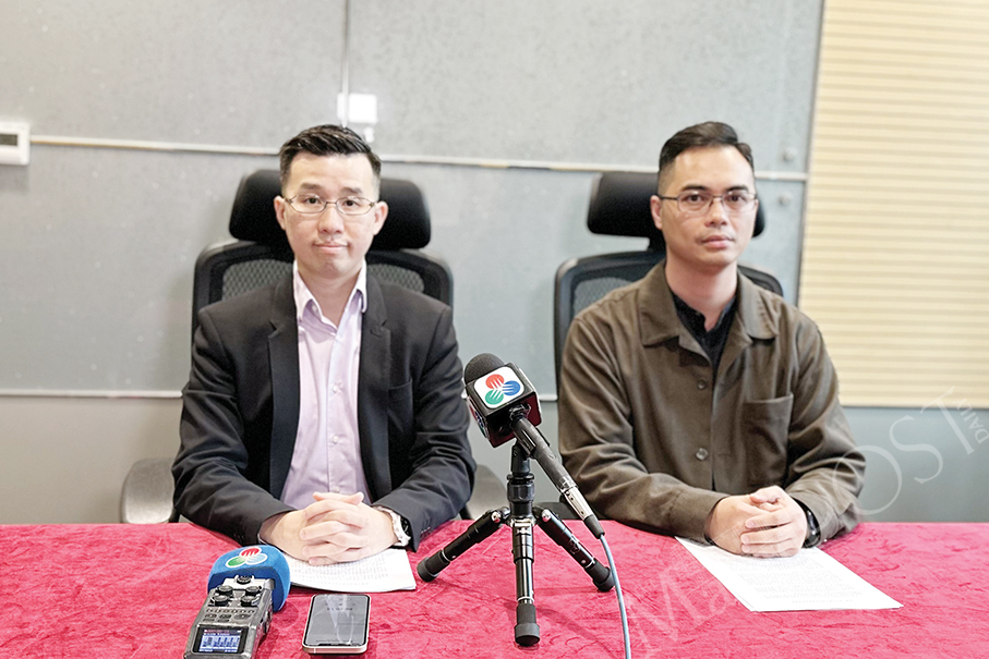 Government-appointed Central District Social Services Consultative Council Deputy Convener Lei Chong In (left) and fellow council member Tam Chan Lam pose during yesterday’s press briefing after the council’s closed-door meeting at the Patane Municipal Market Activity Centre. – Photo: Yuki Lei
