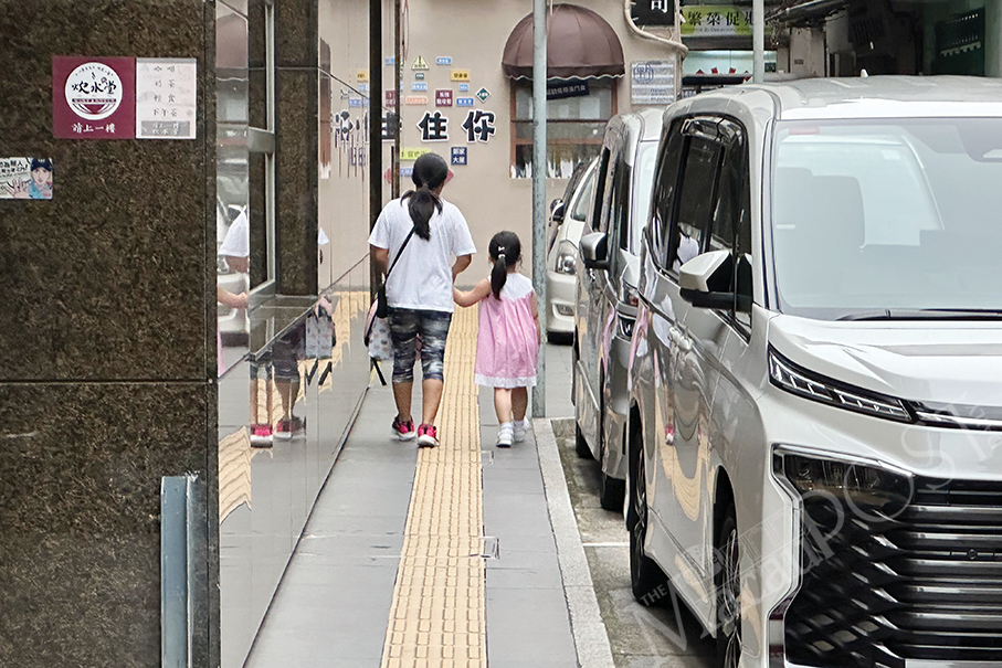 A kindergarten student and her family’s domestic helper walk along Rua da Ribeira do Patane yesterday. – Photo: Yuki Lei