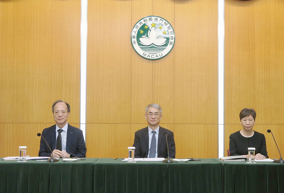 Secretary for Administration and Justice André Cheong Weng Chon (centre), Financial Services Bureau (DSF) Director Stephen Iong Kong Leong (left) and Deputy Director Chong Seng Sam look on during Friday’s Executive Council press conference at Government Headquarters. – Photo courtesy of TDM
