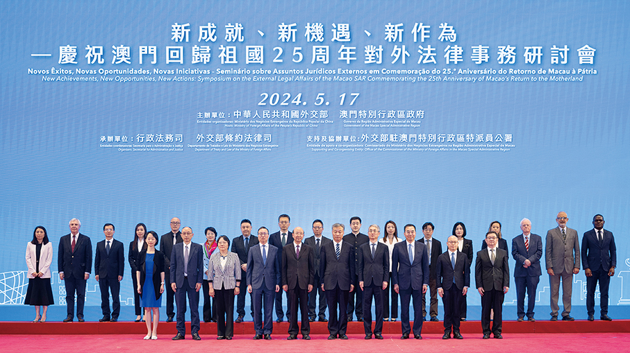 Participants in a symposium on external legal affairs hosted by the Ministry of Foreign Affairs and the local government in Macau pose for a group photo on Friday, including Assistant Foreign Minister Miao Deyu (front, fifth from right), Macau-based Foreign Ministry Commissioner Liu Xianfa (front, sixth from right), and MSAR Government Secretary for Administration and Justice André Cheong Weng Chon (front, fourth from right). – Xinhua