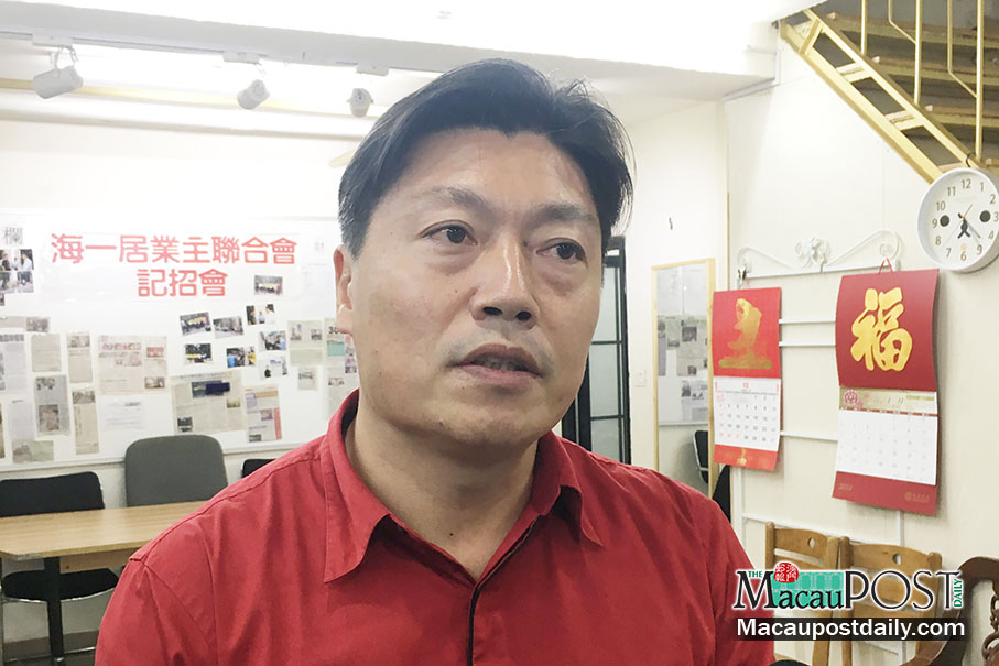 Pearl Horizon Condominium Owners United Association President Kou Meng Pok speaks to reporters at the association during an interview yesterday. Photo: Debby Seng