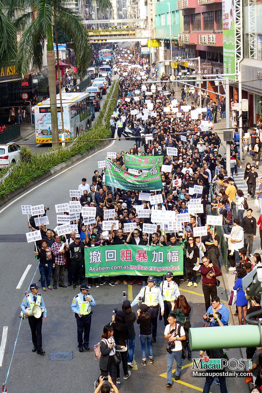 Protesters, led by lawmaker-cum-unionist Jose Pereira Coutinho (centre, first row behind main banner), march in Rua do Campo yesterday urging the government to revoke its increased vehicle fees and charges. The banner reads “revoke the brutal increase”. Photo: Iong Tat Choi