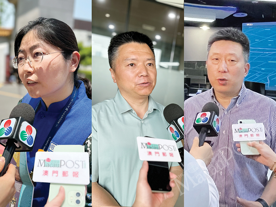 Nanjing Museum volunteer guide Chen Xuan (from left to right), Baixia High-Tech Zone Qinhuai Silicon Alley Department Head Chen Anding, and Jiangsu Tiana Smart Science & Technology Co. Ltd Chairman Yang Lei speak to reporters on the sidelines of the delegation’s visit to Nanjing and Wuxi on Friday and Saturday respectively. – Photo combo: Yuki Lei & Maria Cheang Ut Meng