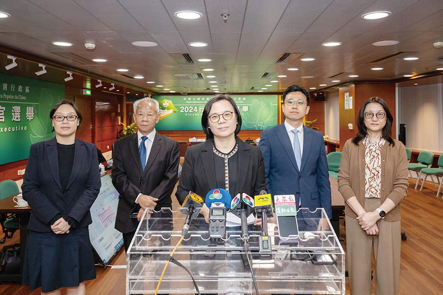 Flanked by her fellow members, Chief Executive Electoral Affairs Commission (CAECE) President Song Man Lei (centre) briefs reporters on Friday after a closed-door meeting of the commission at the Public Administration Building on Rua do Campo. – Photo: GCS
