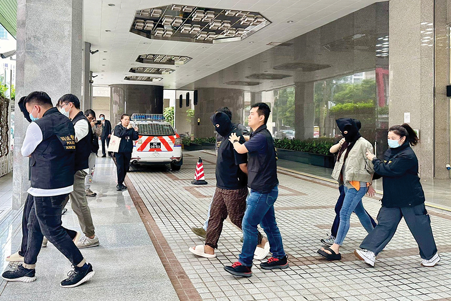 The three hooded loan-sharking suspects are escorted by Judiciary Police (PJ) officers from the PJ headquarters to a police vehicle in Zape on Friday.