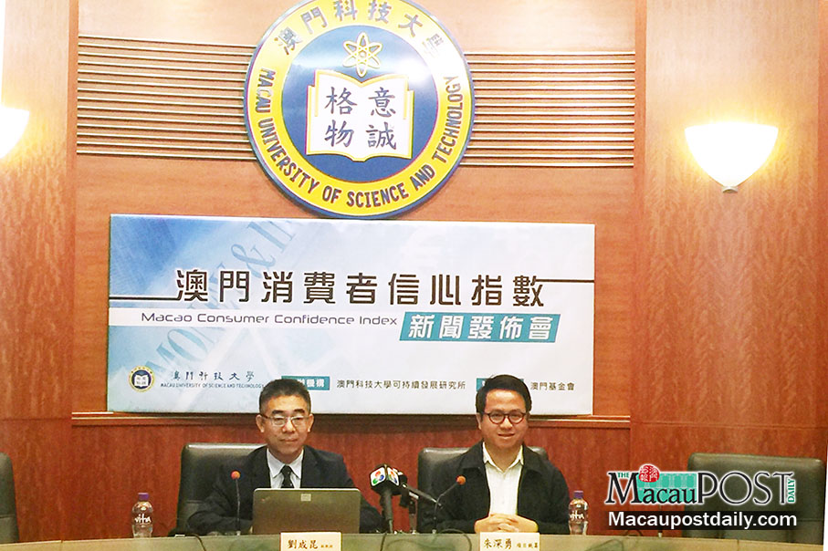 The results of the survey on Macau’s Consumer Confidence Index (CCI) for the fourth quarter last year compared to all previous results were presented in a press conference yesterday, hosted by Associate Professor Liu Chengkun of the university’s Institute for Sustainable Development (ISD), and project co-ordinator Chu Sam Iong, on the MUST campus in Taipa.