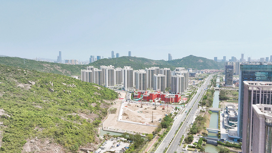 This undated handout photo released by Macau Urban Renewal Limited (MUR) on Monday shows the construction site for the future secondary school next to the completed kindergarten and primary school in the Macau New Neighbourhood (MNN) residential estate in Hengqin.