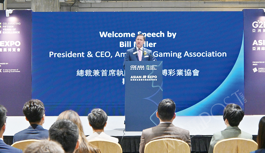 American Gaming Association (AGA) President and CEO Bill Miller delivers a speech at the opening ceremony of the Global Gaming Expo Asia (G2E Asia) and the Asian IR Expo yesterday at The Venetian Macao in Cotai.