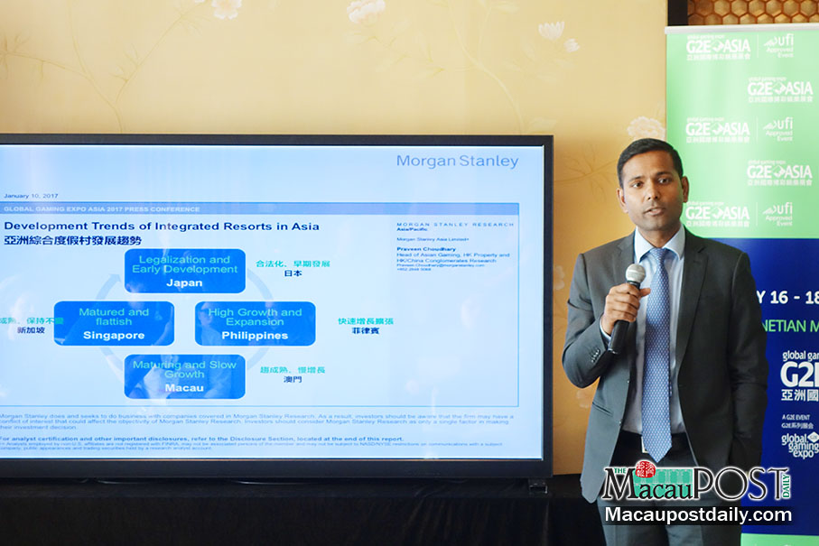 Praveen Choudhary, managing director and head of Hong Kong Property, Hong Kong/China Conglomerates and Asia Gaming Research at Morgan Stanley, addresses a press conference at Galaxy Macau yesterday about the 11th G2E Asia gaming expo at the Venetian in May. Photo: Annie Cheung