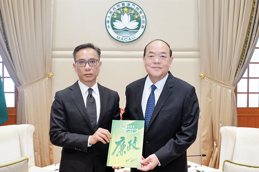 This undated handout photo released by Macau’s anti-graft body yesterday shows Commissioner Against Corruption (CCAC) Chan Tsz King (left) handing his 2023 Annual Report to Chief Executive Ho Iat Seng.