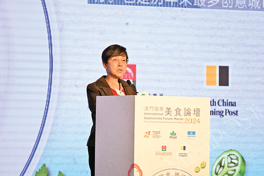 Macau Government Tourism Office (MGTO) Director Maria Helena de Senna Fernandes delivers a speech at yesterday’s “International Gastronomy Forum, Macao” at Macau Fisherman’s Wharf.