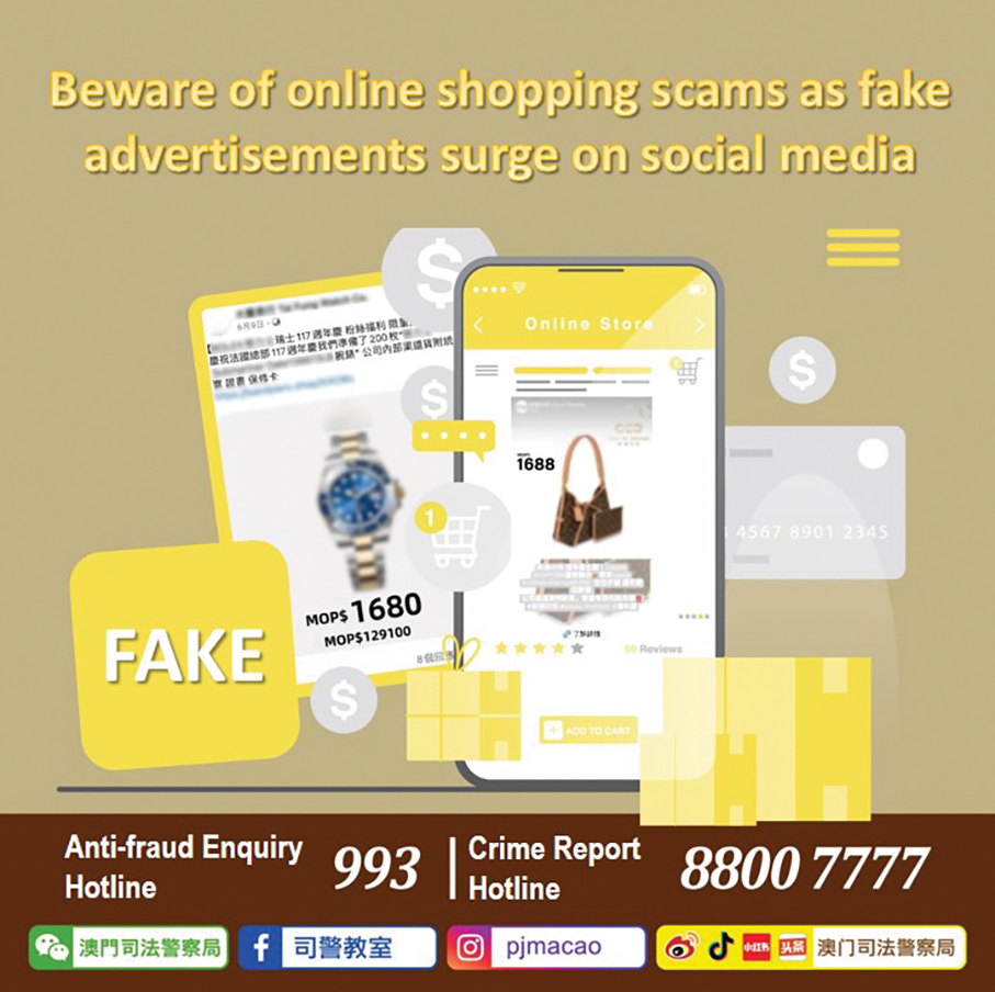 The Judiciary Police (PJ) warned yesterday of a recent surge of fake ads on social media, urging members of the public in a statement to be vigilant against online shopping scams.