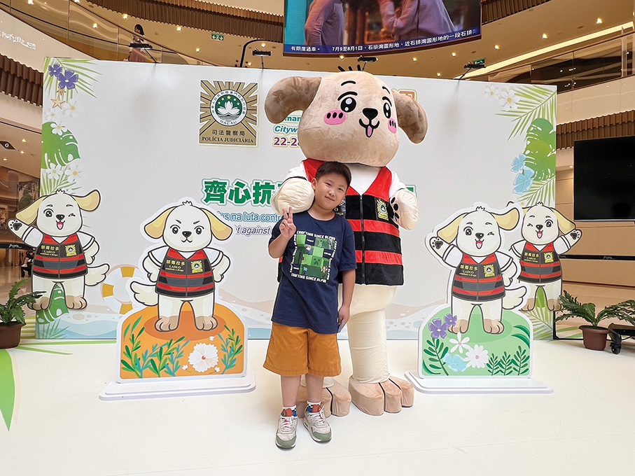 This handout photo provided by the Judiciary Police (PJ) on Saturday shows a boy posing with the PJ anti-drug mascot Lador at NOVA Mall in Taipa.