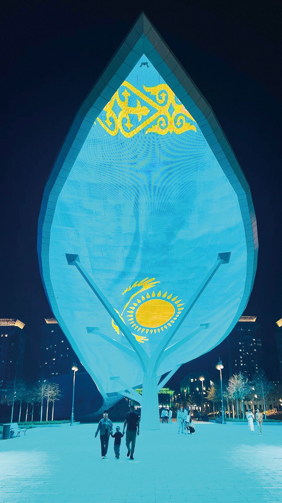 Pedestrians walk near a brightly illuminated art installation in the Kazakh capital of Astana on Sunday. – Xinhua