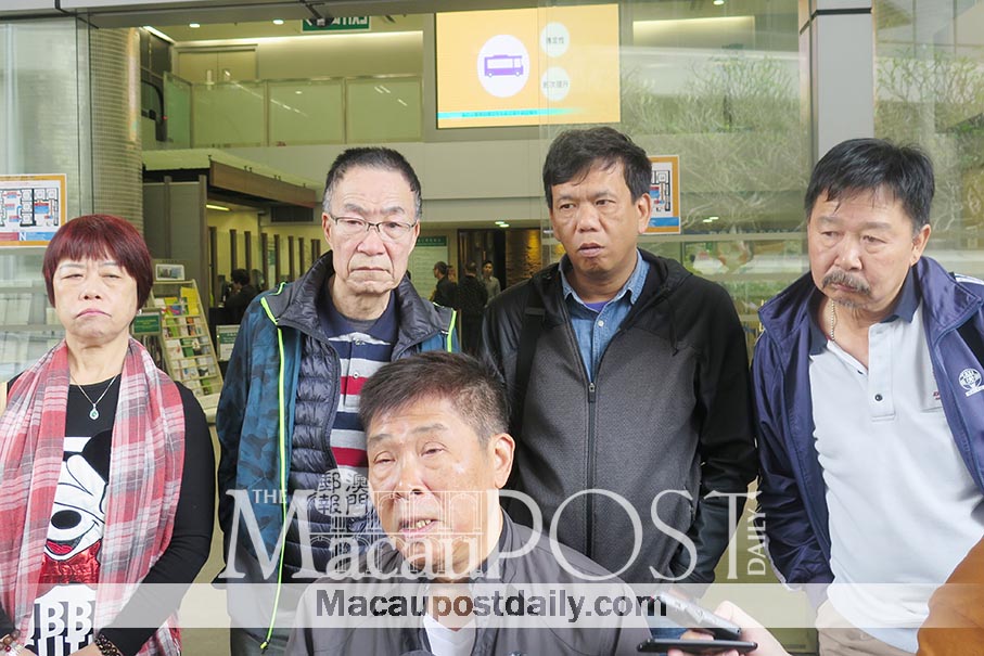 Macau Taxi Drivers Mutual Association President Tony Kuok Leong Son (front), accompanied by members of his and other taxi groups, speaks to reporters yesterday after a closed-door meeting with the Transport Bureau (DSAT) about their proposed taxi fare hike. Photos: Tony Wong