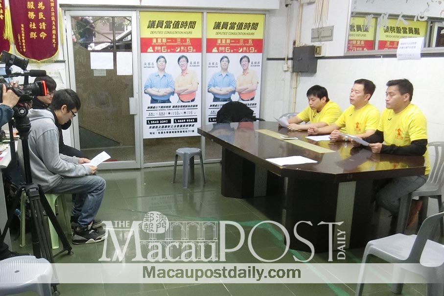 Flanked by two fellow members, People Power Vice Chairman Cheong Weng Fat (centre, seated at the table) addresses yesterday’s press conference about his union’s backing of casino smoking lounges, at the office of lawmakers Antonio Ng Kuok Cheong and Au Kam San in Iao Hon. Photo: People Power