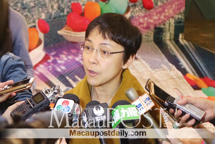Macau Government Tourist Office (MGTO) Director Maria Helena de Senna Fernandes speaks to reporters yesterday on the sidelines of a banquet hosted by the Social Welfare Bureau (IAS) at the Macau Fisherman’s Wharf Convention & Exhibition Centre. The event marked the bureau’s 50th anniversary. Photo: Debby Seng