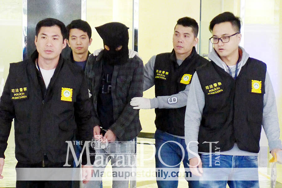 Judiciary Police (PJ) officers escort the hooded chips robbery suspect from the PJ headquarters in Zape to a PJ vehicle yesterday. – Photo: Iong Tat Choi