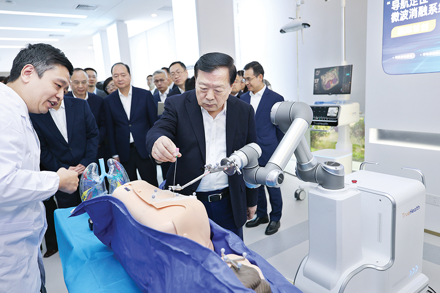 State Council’s Hong Kong and Macao Affairs Office (HKMAO) Director Xia Baolong (centre) tries out medical equipment at a health tech company in Hengqin on Friday. – Photos: HKMAO