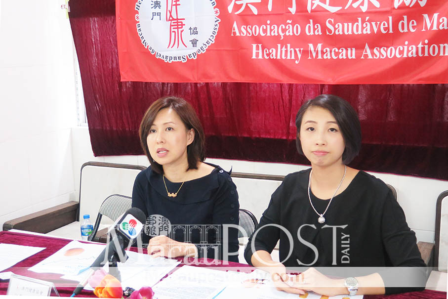 Healthy Macau Association Director General Virginia Kong Wai Sum (left) speaks during yesterday’s press conference about the findings of the group’s survey, while its Deputy Director General Gloria Sio Un Teng looks on, at the association’s office. – Photo: Tony Wong