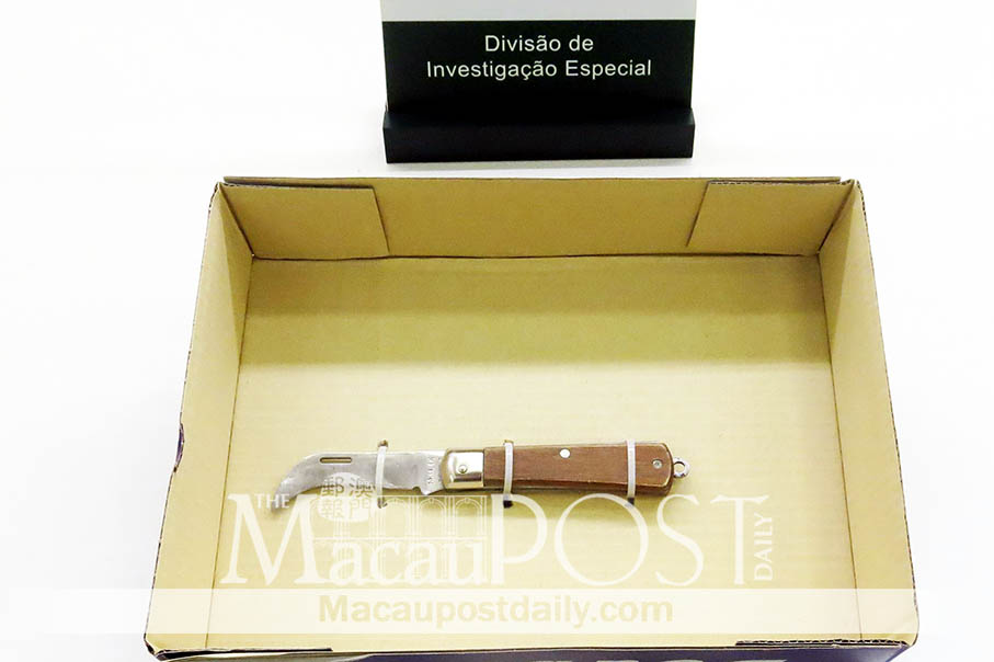 This photo taken yesterday in a Judiciary Police (PJ) press room shows the knife seized from the gate-kicking suspect who allegedly resisted arrest and attacked his interrogators. Photo: Iong Tat Choi