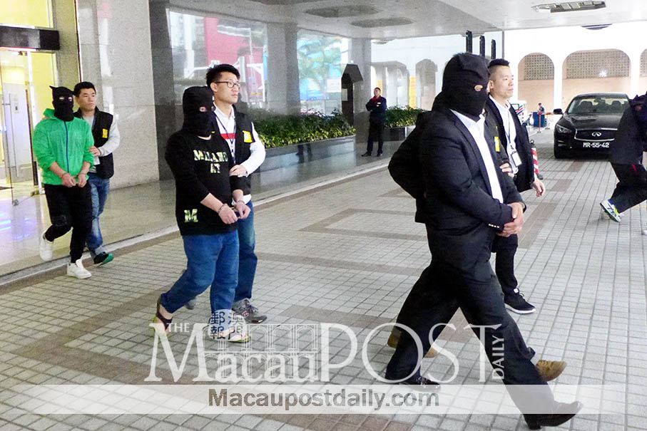 Judiciary Police (PJ) officers escort three hooded UnionPay fraud suspects from the PJ headquarters in Zape to a PJ vehicle yesterday. –Photo: Iong Tat Choi