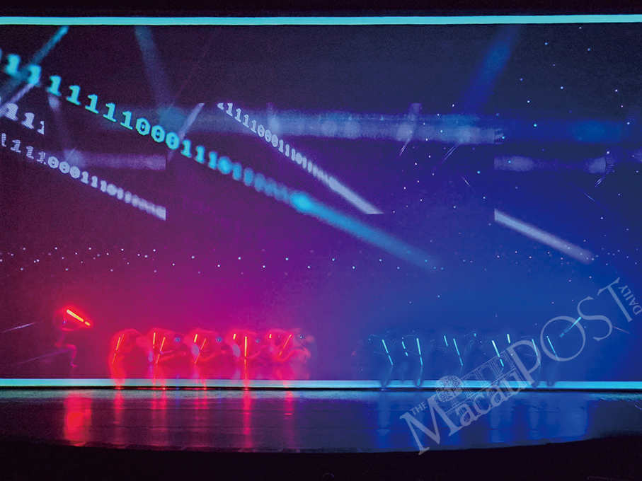 This photo taken on Saturday night during the large-scale contemporary stage production “Dance Drama: Dragon Boat” at The Venetian Theatre shows a scene where dancers engage in a virtual reality simulation of dragon boat competition using lightsabres. – Photo: William Chan